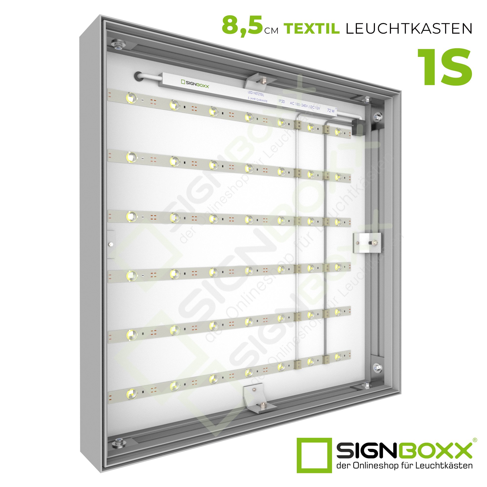 Sie können wahlweise mit oder ohne Standfüße, Abhängeset oder Wandhalterungen bestellen. Das Format entscheidet, wie die Halterungen angebracht werden müssen, um die Leuchtreklame im gewünschten Format verwenden zu können. Profiltiefe beträgt 8,5 cm.
