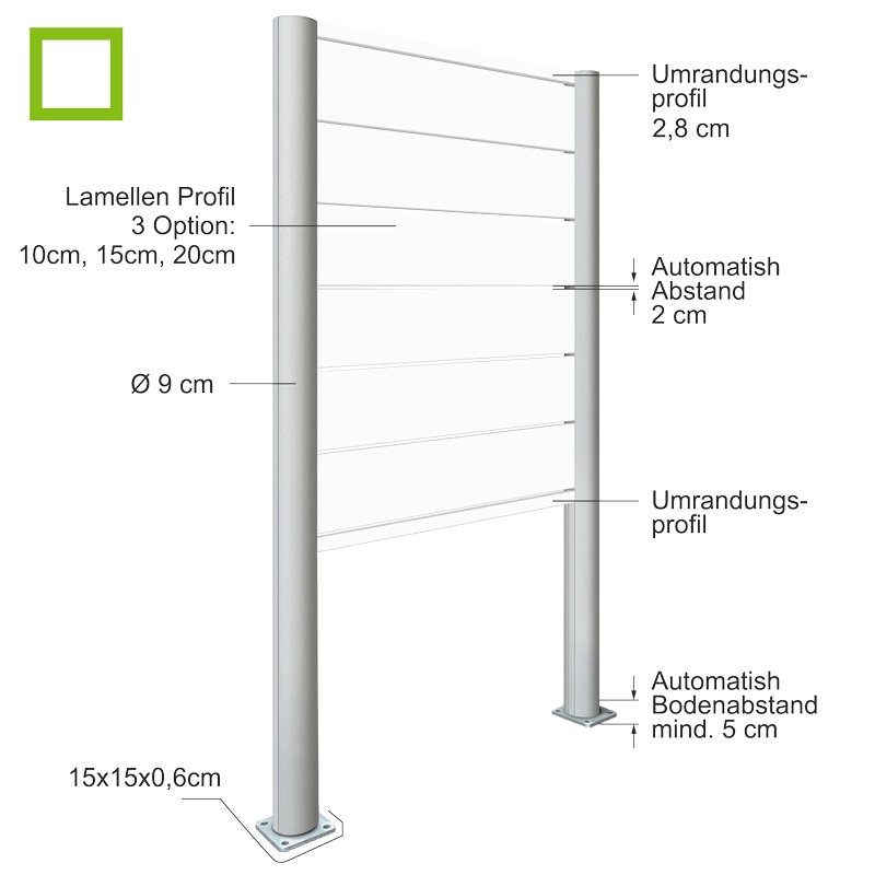 Hier können Sie die Lamellenhöhe auswählen (10cm,15cm, oder 20cm) und Lamellen Anzahl.Wegen der Füßen-Höhe ist die Werbefläche 5 cm weniger, z.B. 100 cm Werbefläche wird 95 cm sein.