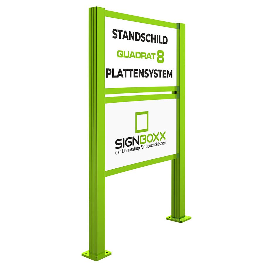 Die Schilder bestehen aus hochwertigen Aluminiumprofilen und sind standardmäßig eloxiert, weiß lackiert oder in jeder gewünschten RAL-Farbe erhältlich. Die Profile der Ständer und Schilder können in verschiedenen Farben lackiert werden.